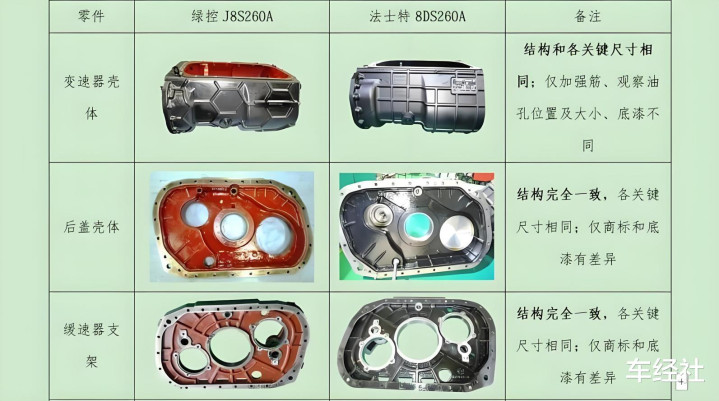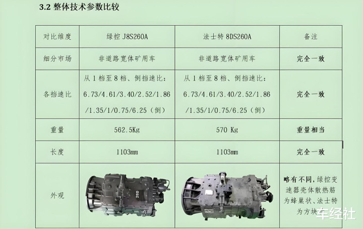 法士特与绿控传动之间的技术争议并非凭空而来,而是建立在详实的实物拆解与数据比对基础之上的严肃指控。法士特在声明中详细披露,通过从售后市场购买4台绿控J8S260A变速器总成并进行全面拆解后发现,这款产品与法士特8DS260A变速器总成在整体技术路线、内部零件结构以及零件实际测量结果等方面呈现出令人震惊的“高度一致性”。两款产品均面向非道路宽体矿用车市场,从1档至8档、倒挡速比完全一致,产品长度同为1103毫米,重量也仅有微小差异。更令人难以置信的是,技术人员在拆解过程中发现,绿控J8S260A的二轴、缓速器拨叉等零件表面竟直接印有法士特的注册商标,各挡位拨叉毛坯与法士特产品完全一致,仅在标注零件号的位置进行了刻意打磨处理。这种违背正常商业逻辑的异常行为,无疑为抄袭指控增添了最有力的佐证。